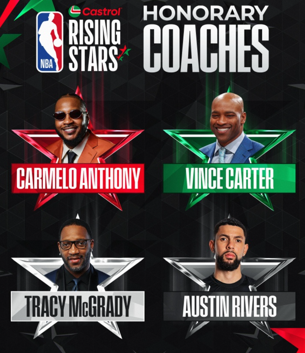 NBA在今天公布 今年新秀赛的4名荣誉主教练,他们分别是:安东尼、卡特、麦迪、小里弗斯。