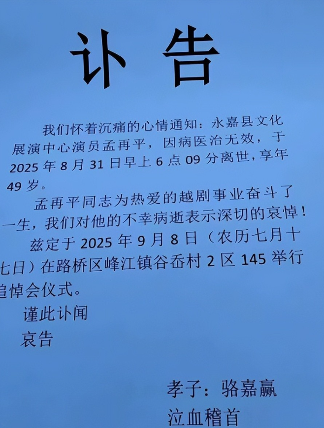 生命有时脆弱得像风中残烛。8 月底,49 岁的越剧演员孟再平终究没能敌过癌症的侵蚀,在与病魔抗争数年后溘然长逝。继朱媛媛之后,又一位舞台艺术家因癌症离世,让无数戏迷扼腕叹息。近日,她的追悼会细节陆续曝光,从肃穆的送葬队伍到儿子特殊的送别仪式,每一个画面都浸透着不舍与敬意。