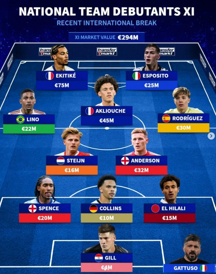 直播吧9月10日讯 德转盘点了在本次国际比赛日迎来自己国家队首秀的11人阵容,其中埃基蒂克领衔,以下为具体阵容: