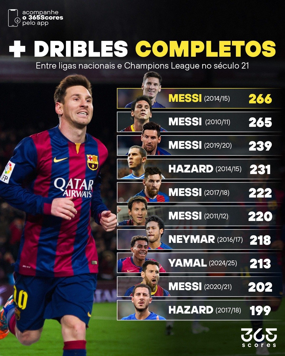 另外四个位置,被三个球员瓜分,其中自认为过人仅次于梅西、远超C罗的阿扎尔在这个榜单上确实仅次于梅西、远超C罗。阿扎尔有两个位置,一个是第四,2015赛季,231次,这也是前六中唯一不是梅西的名字。另一个是第十,2018赛季,199次,唯一低于200的位置。都是切尔西时期的阿扎尔。他确实远超C罗,因为C罗在前十中是0次,而且不只是前十。第七是2017赛季的内马尔,218次。上赛季的亚马尔跻身前十,排名第八,213次。